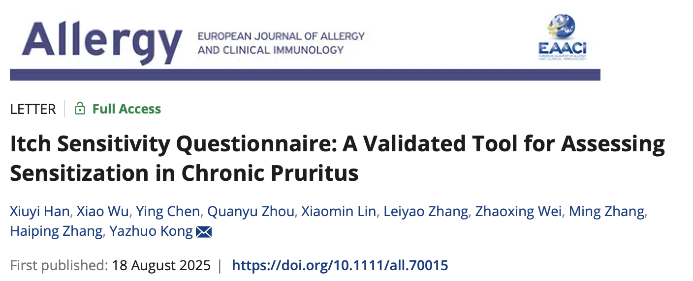 文章信息:Han, X., Wu, X., Chen, Y., Zhou, Q., Lin, X., Zhang, L., Wei, Z., Zhang, M., Zhang, H., & Kong, Y. (2025). Itch Sensitivity Questionnaire: A Validated Tool for Assessing Sensitization in Chronic Pruritus. Allergy : 1–3, http://doi.org/10.1111/all.70015