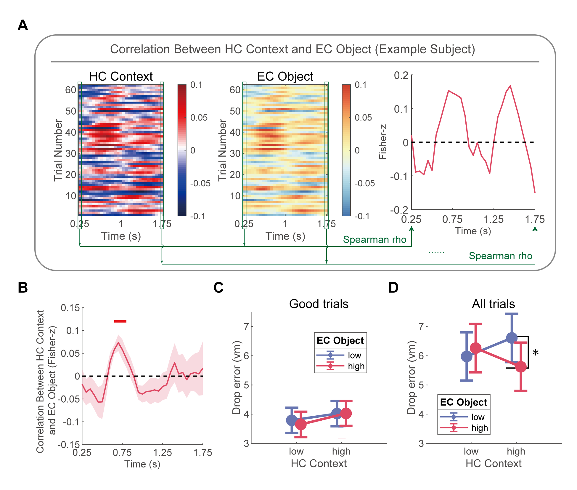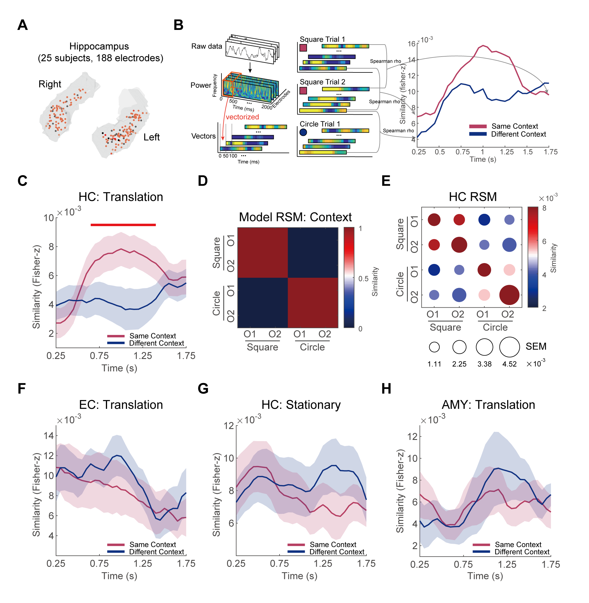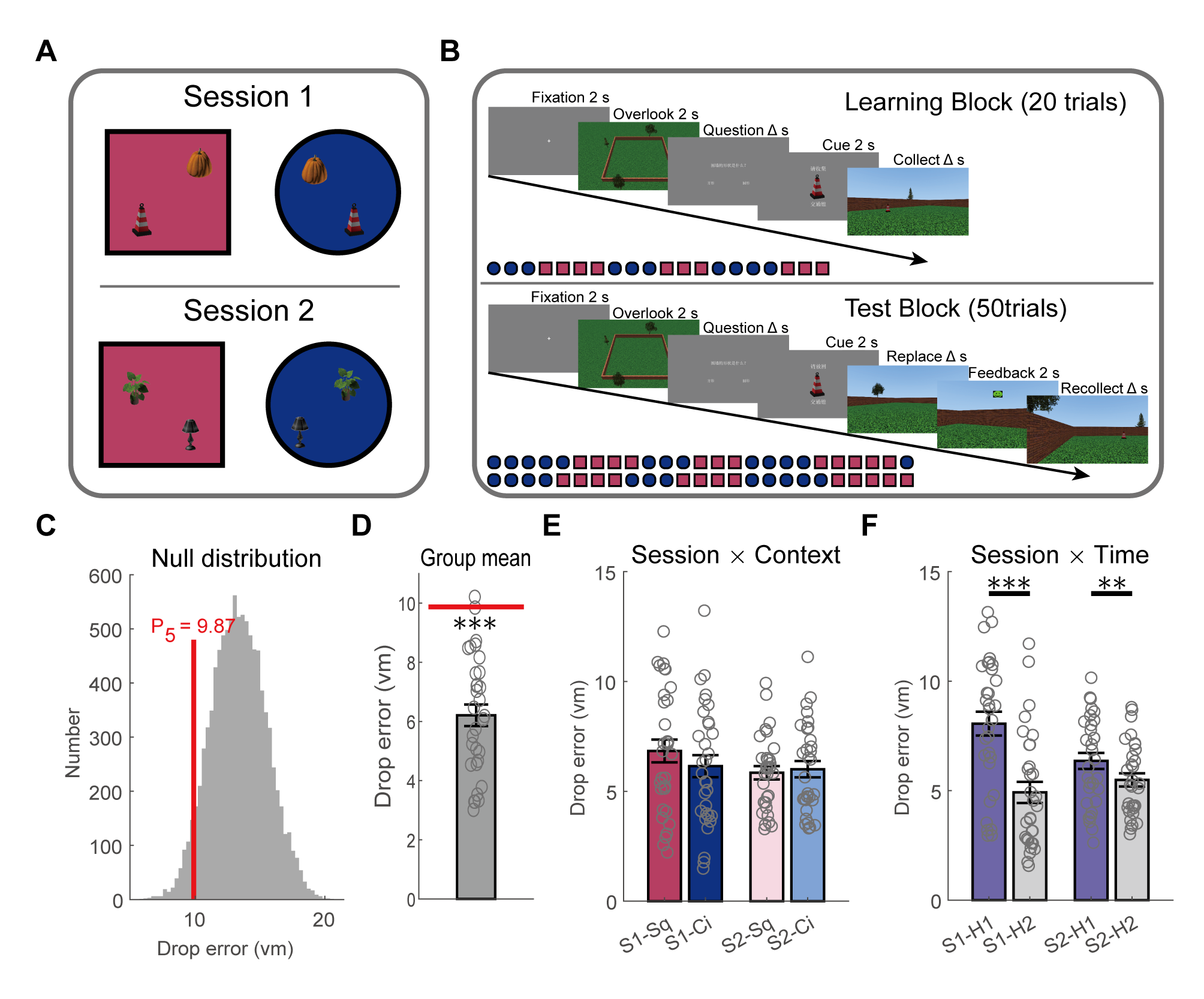 研究者采用情景依赖的虚拟空间导航任务(图1A),并同步监测被试完成任务时海马和内嗅的电生理活动。任务要求被试在两个场景中分别记住两个物体的位置,这两个物体在两个场景中的外观相同,但在不同场景中处于不同的位置。被试的导航行为整体较好(误差显著低于随机分布5%水平,图1C),且在两个场景间没有显著差异(图1E)。任务过程中被试表现出较强的学习效应(图1F)。