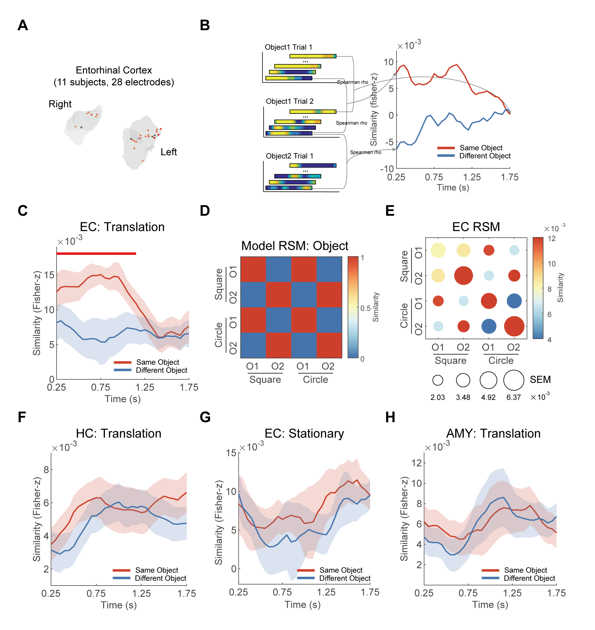 相反,在直线运动过程中内嗅(图3A)的活动在相同物体中的相似性(图3B)显著高于不同物体间的相似性(图3C-E)。而在海马和杏仁核中都没有呈现出这种物体特异性的神经活动(图3F-H)。